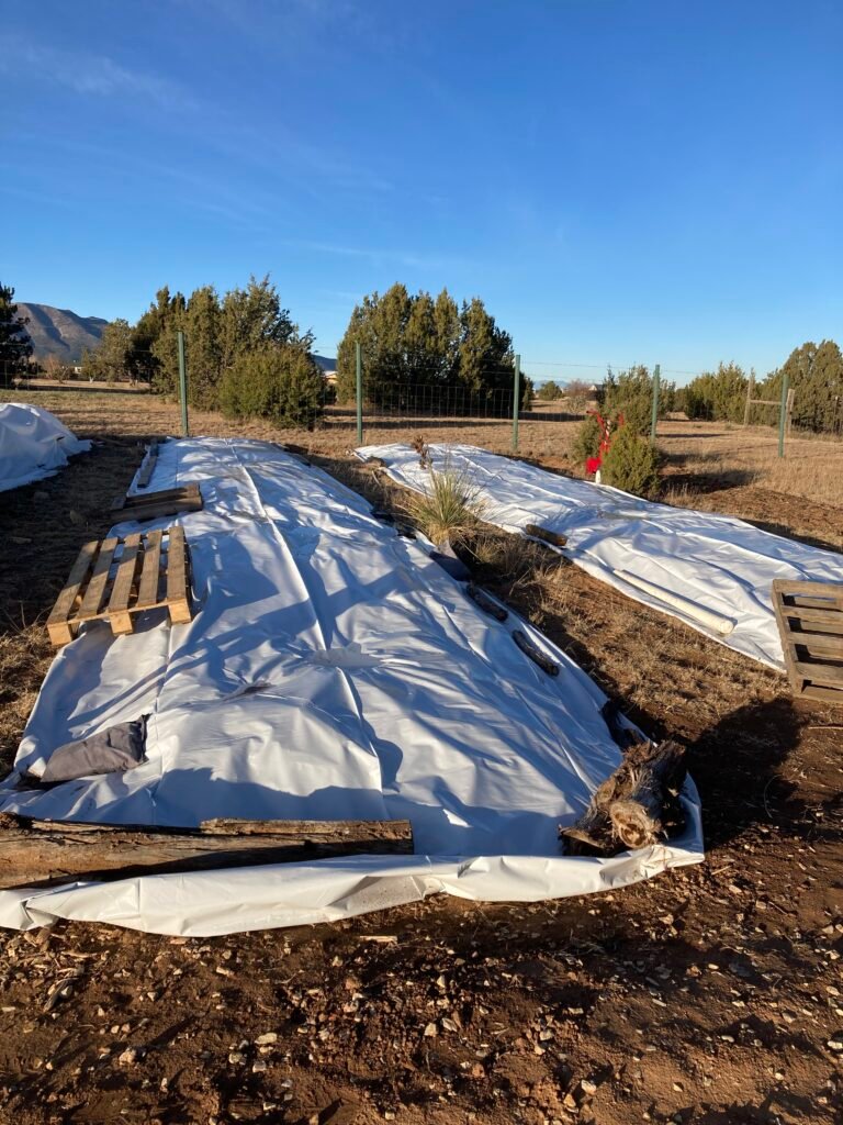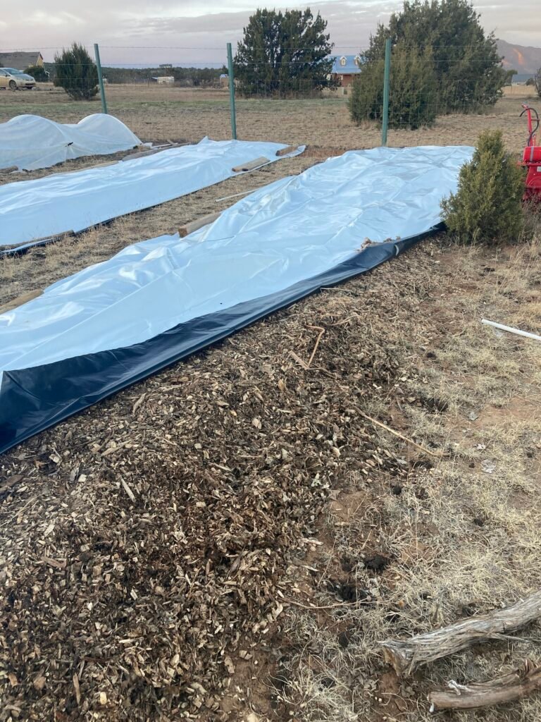 Covered the mulch with silage tarps we ordered from Farm Plastic Supply [2].