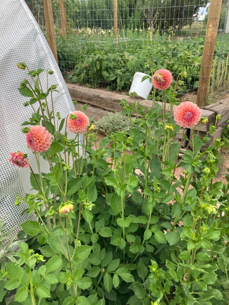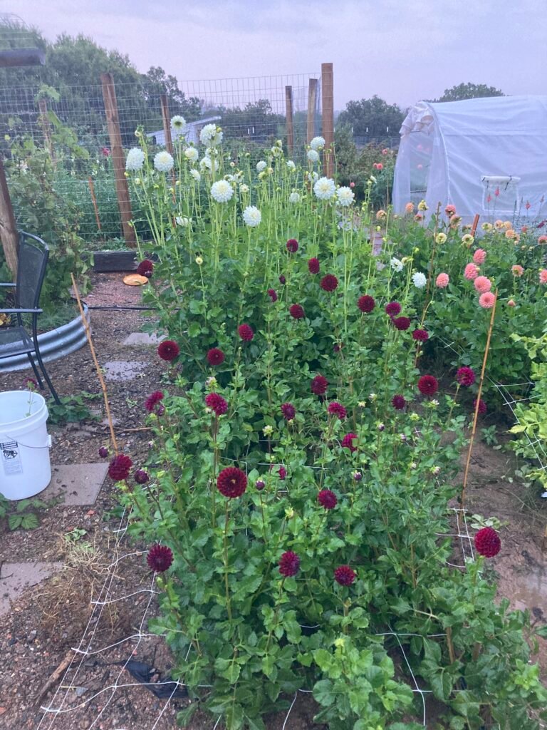 Chimancum Troy (purple), Boom Boom White (white), and Rock Run Ashley (pink) dahlia patch